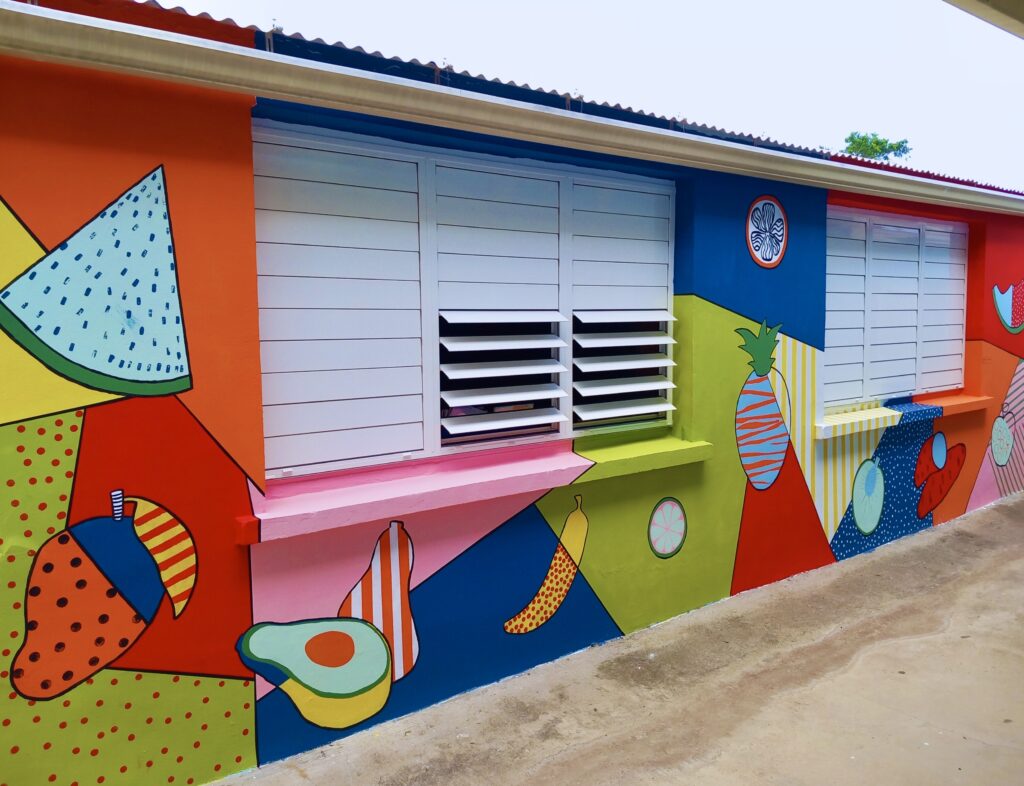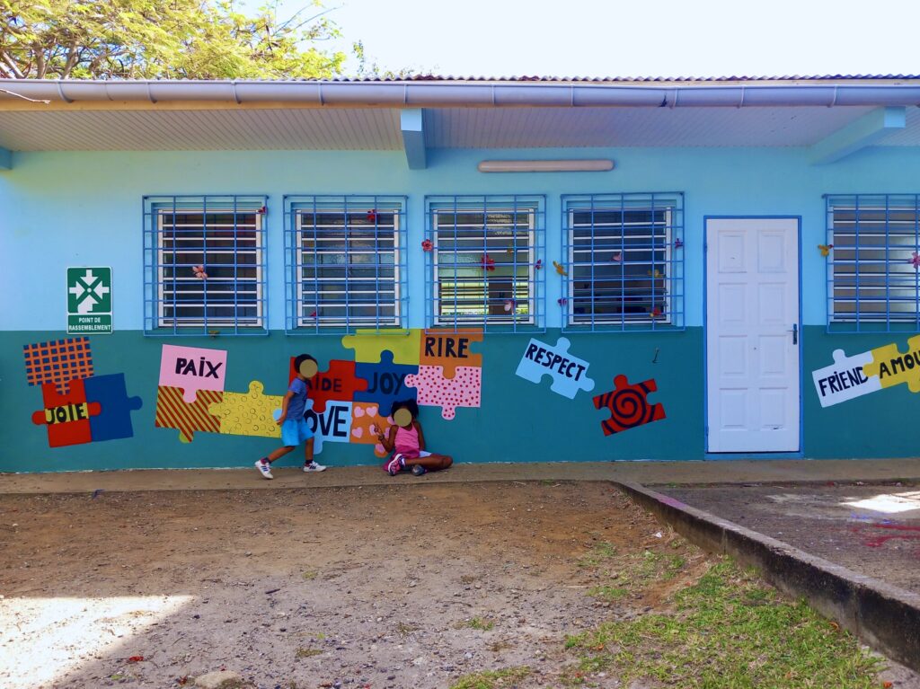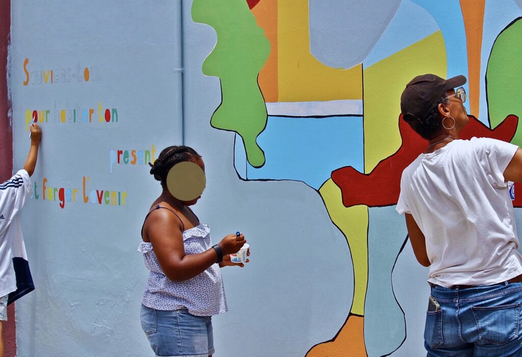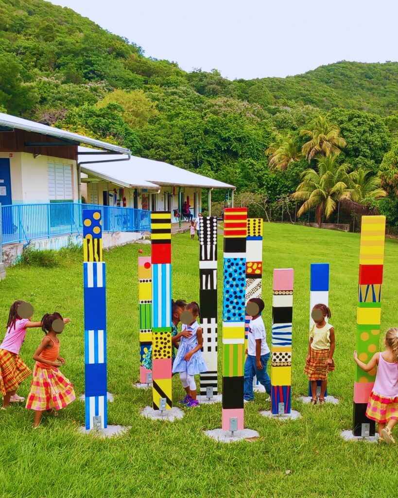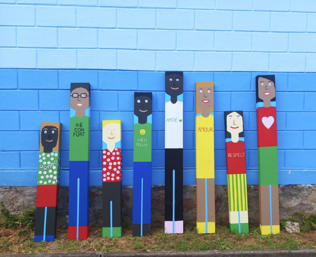 • créations collectives in situ : fresques murales, totems, installations, œuvres plastiques communes.